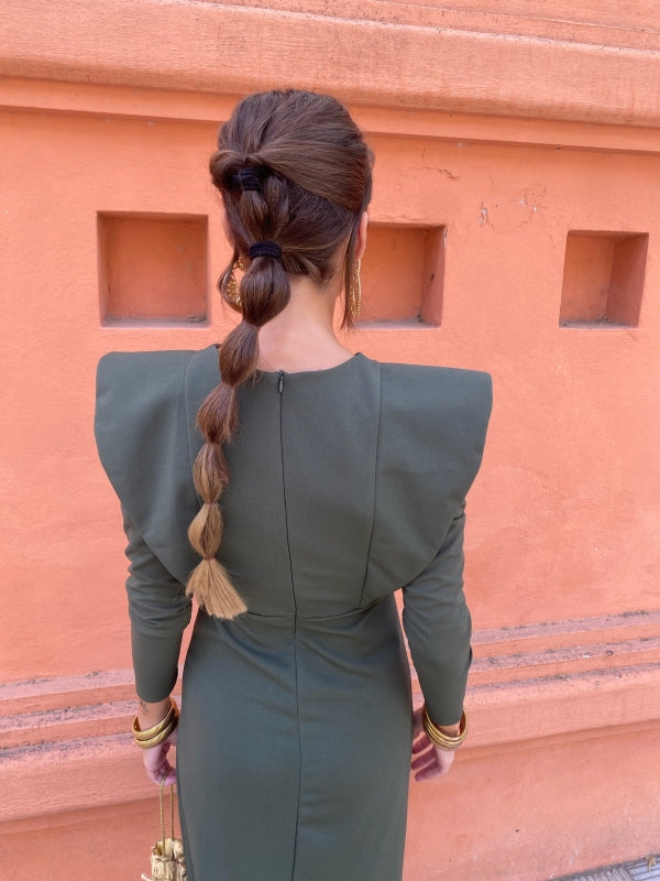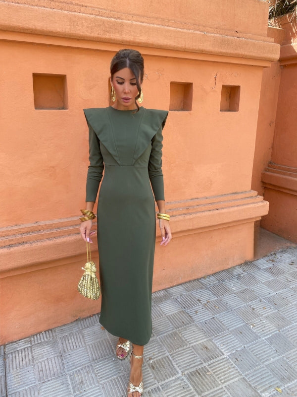 Available in a sophisticated olive green or an elegant warm brown, this fitted midi guest dress offers a clean and flattering silhouette. It features a round neckline and long sleeves that complement the overall design. The highlight of this piece lies in the carefully folded ruffles on the shoulders, creating a sculptural, architectural shape that elevates the design to the next level.