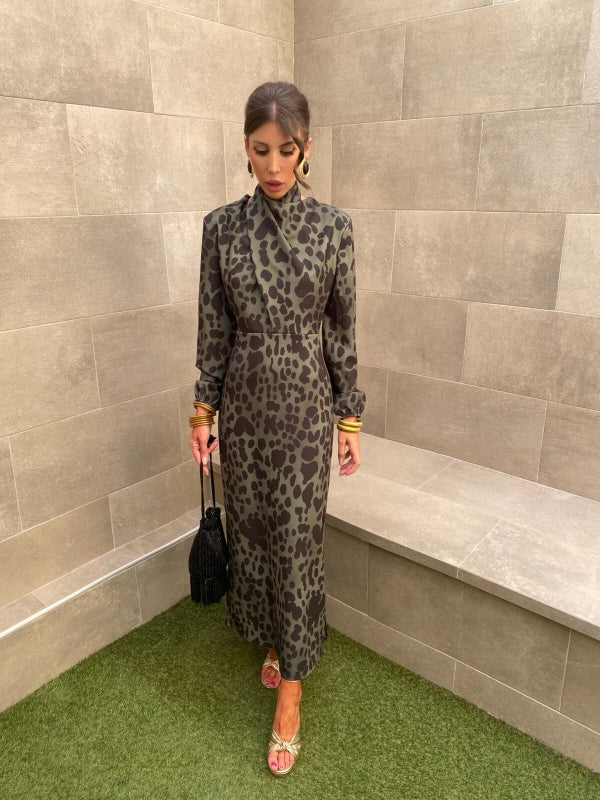 It is ideal for any daytime wedding guest looking to stand out with a look full of personality. The dress features an animal print in shades of olive green and brown that creates a striking and sophisticated contrast. The design is distinguished by a high neckline with an original draping that crosses in front, providing a touch of elegance and a subtle neckline.