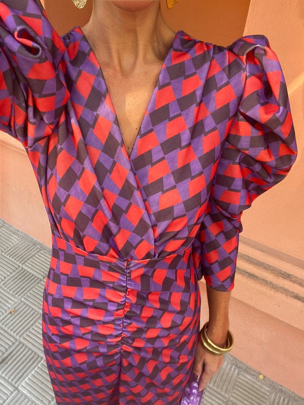 Crafted in a drapey crepe fabric, the dress is distinguished by its captivating geometric diamond print in the vibrant combination of Purple, Purple and Pink/Fuchsia. The design features a flattering crossover V-neckline at the bust and a midi length that falls elegantly below the knee.